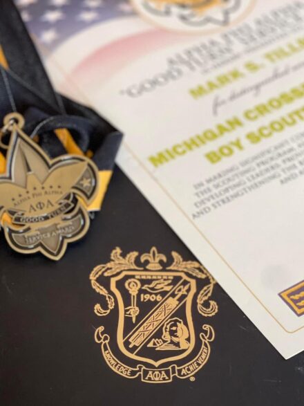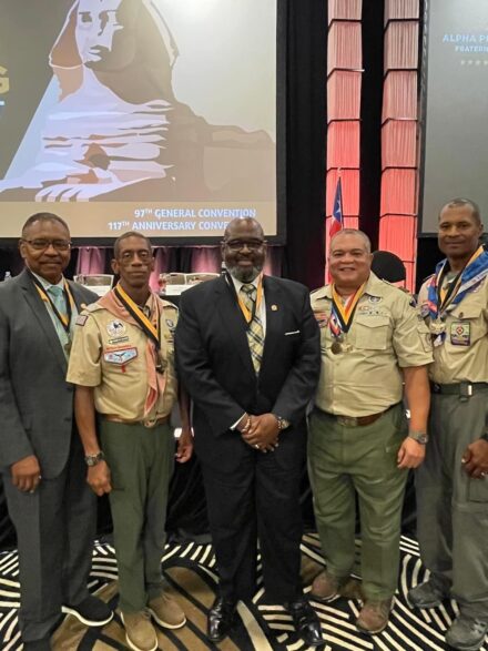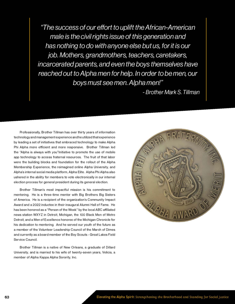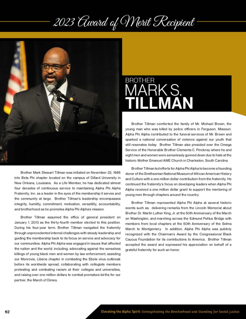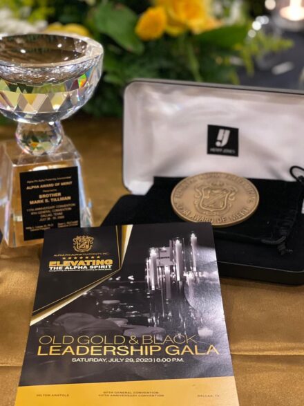 Dallas, TX – July 29, 2023 – This year, at the 97th General Convention / 117th Anniversary Convention, our chapter brother, thirty-fourth General President Brother Mark S. Tillman, was awarded the 2023 Alpha Award of Merit for his years of service to the community and his dedication to the aims of the fraternity. This has become, by tradition and practice, the greatest award bestowed upon a member.